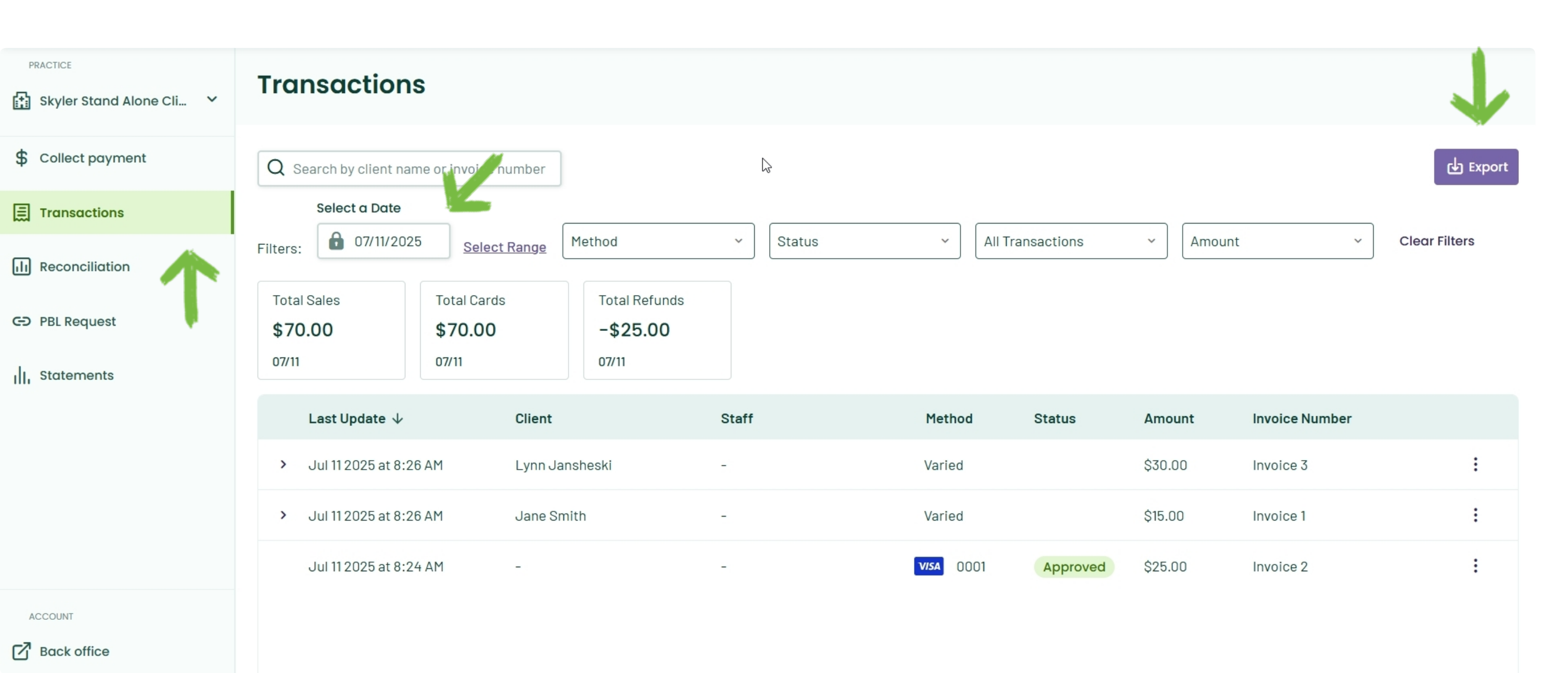 - Navigate to the Transactions tab and filter by the date that is two days prior to your payout report date. This will correspond to the transaction date + 2 business days (T+2) funding schedule. See Understanding your deposits for a clear visualization.