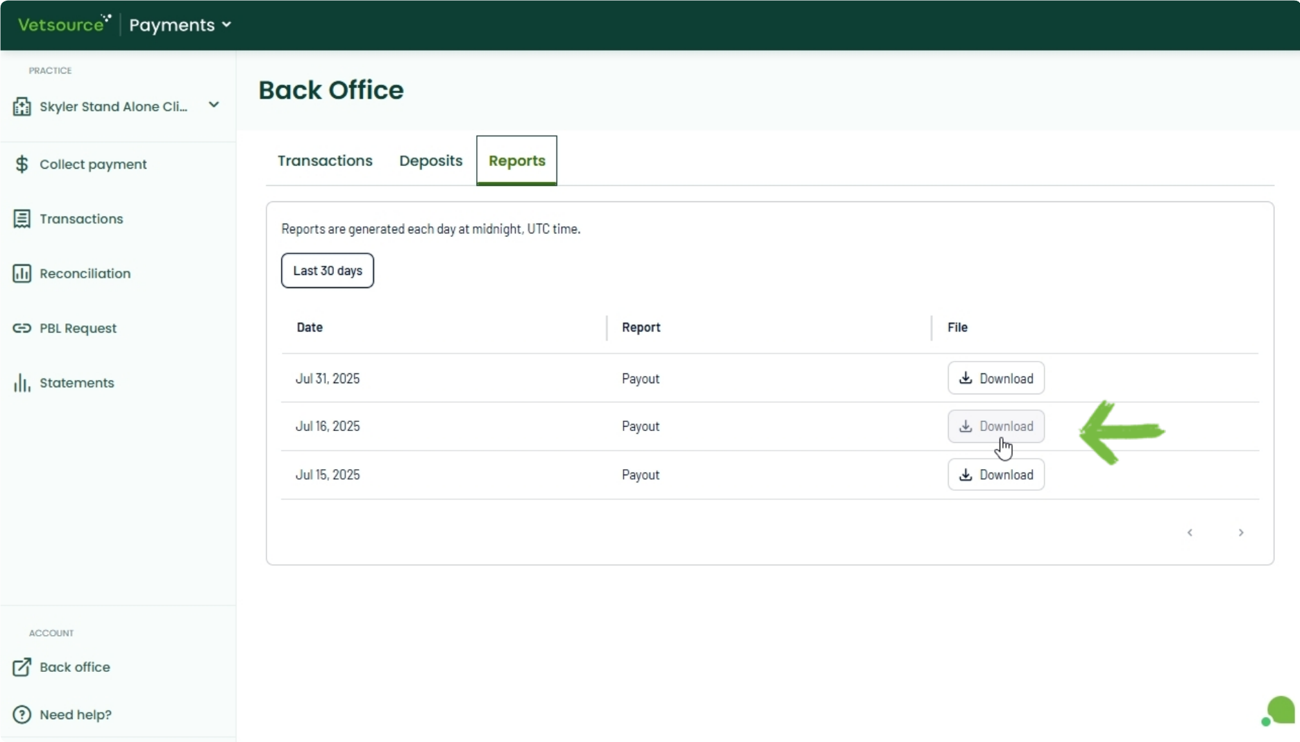 To download a CSV of your daily deposits, simply click the Download button for the desired date on the Reports tab in your Back Office.
