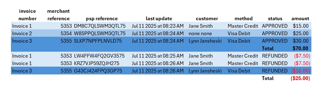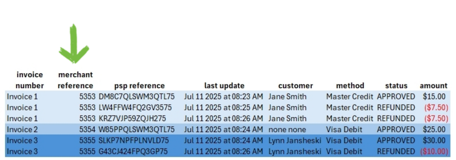 - Now, you can cross-reference the Merchant Reference columns in both reports to find your original payment amounts.