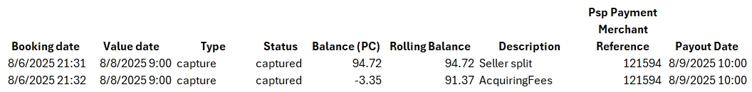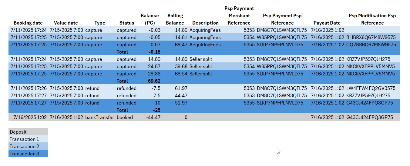 - Re-sort your payout report by Description and sum the AcquiringFees, Seller split, and refunds in the Balance column.