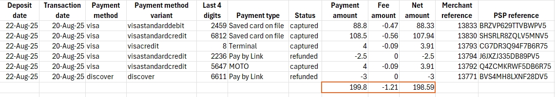 You can filter by a specific deposit date or a date range in the Deposit report tab to download a CSV file containing your detailed deposit information by transaction.