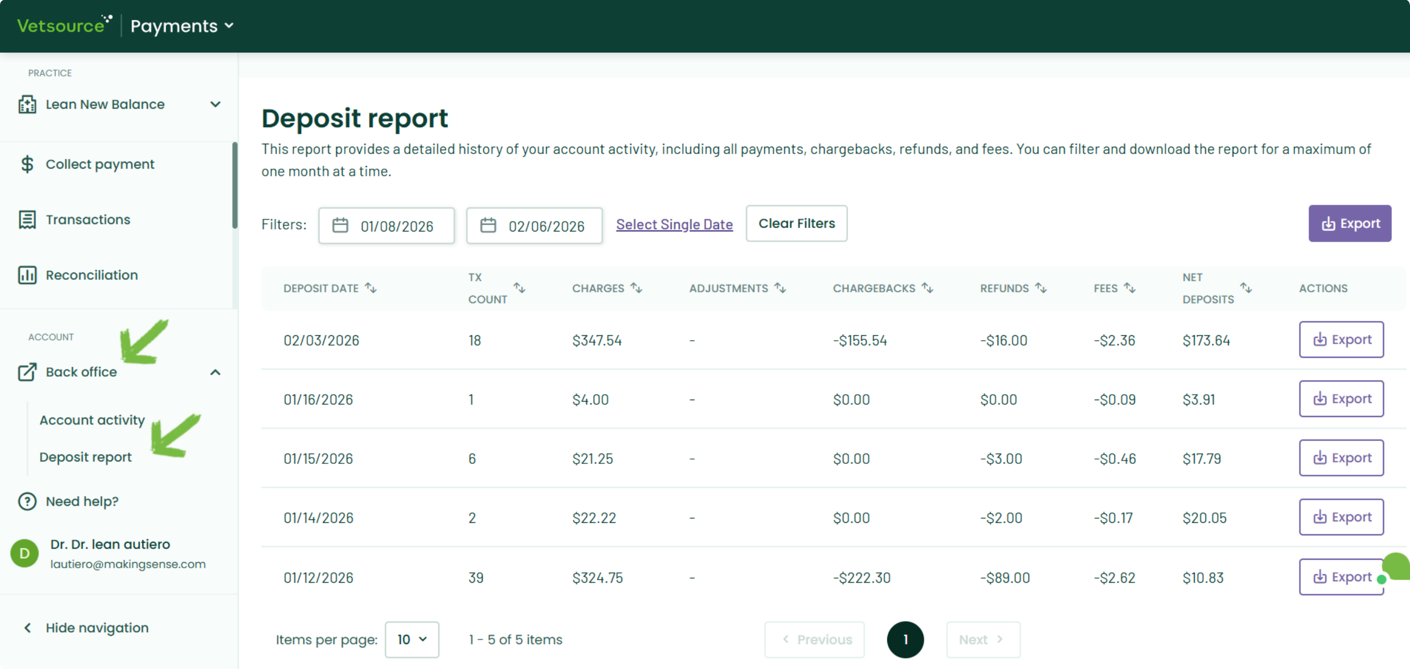 The Deposit Report Dashboard provides instant visibility into your daily cash flow. By centralizing charges, fees, and net deposits, this tool keeps your records accurate and simplifies bank reconciliation.