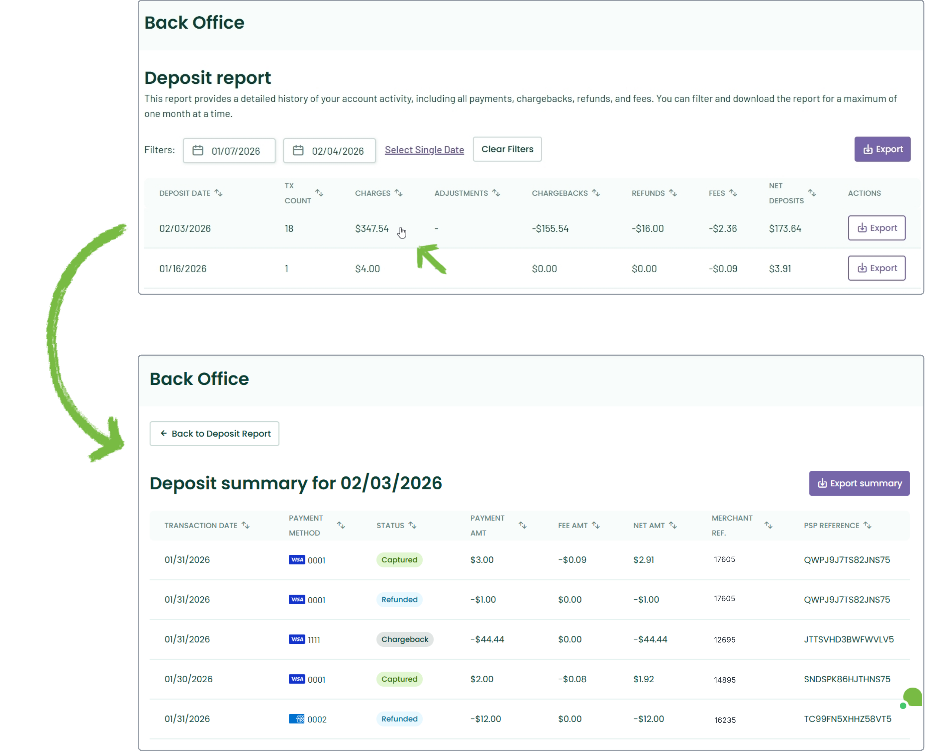 - Export Transaction Detail: Downloads the granular, line-by-line transaction data for every transaction included in those daily deposits.