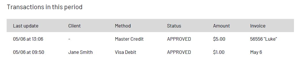 The Search by client name or invoice number field targets the Client and Invoice Number columns in the transactions list.